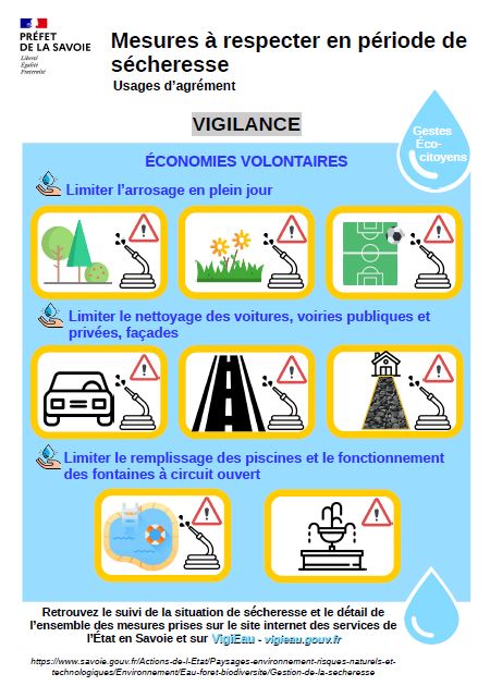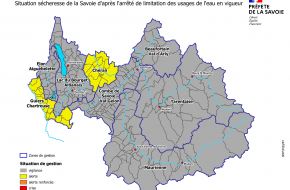 L'arrêté préfectoral n° 2025-1024 du 16 Septembre 2025 acte la levée des mesures de resctriction sur les communes des zones de gestion de Gelon-Combe de Savoie, Lac du Bourget-Albanais et Flon-Aiguebelette. Celles-ci sont néanmoins maintenues en "vigilance" sécheresse.