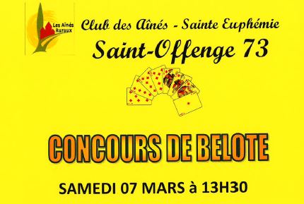 Le Club des Aînés Sainte-Euphémie organise un concours de belote le Samedi 7 Mars à 13h30 à la salle polyvalente de Saint-Offenge.