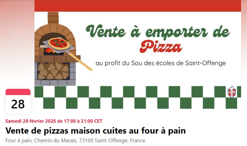 Le Sou des écoles organise une vente de pizzas maison cuites au four à pain, préparées par les parents bénévoles avec des ingrédients issus de nos artisans locaux le Samedi 28 Février, de 17h à 21h, au profit des enfants de l'école.